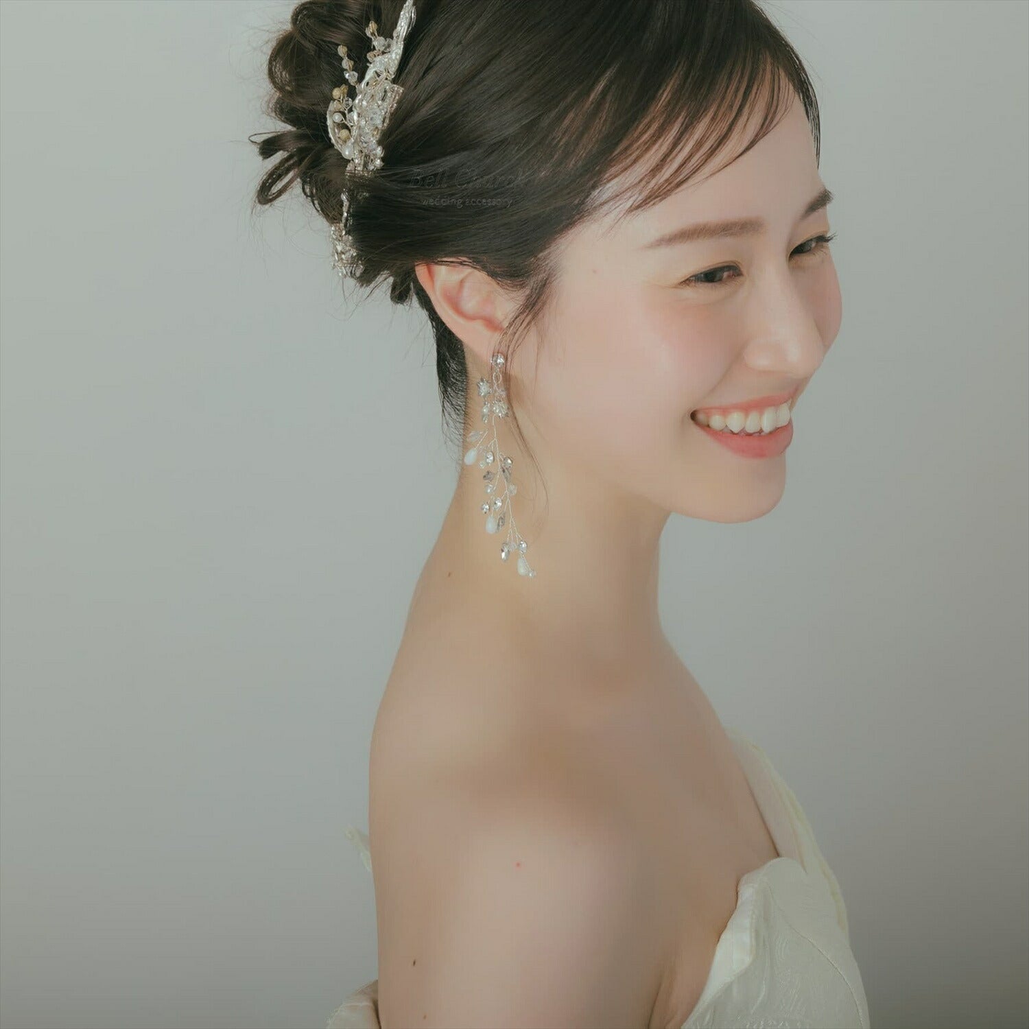 シルバーのヘアアクセサリーと合わせて頂くとより清楚で可憐なブライダルスタイルに。