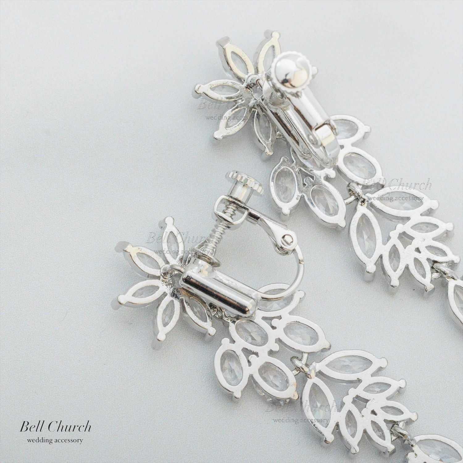 シンプルなシルバーカラーにお花のような印象も持ち合わせているので、お花モチーフのヘアアクセサリーや、ティアラなど幅広く合わせていただけるピアスとなっています。