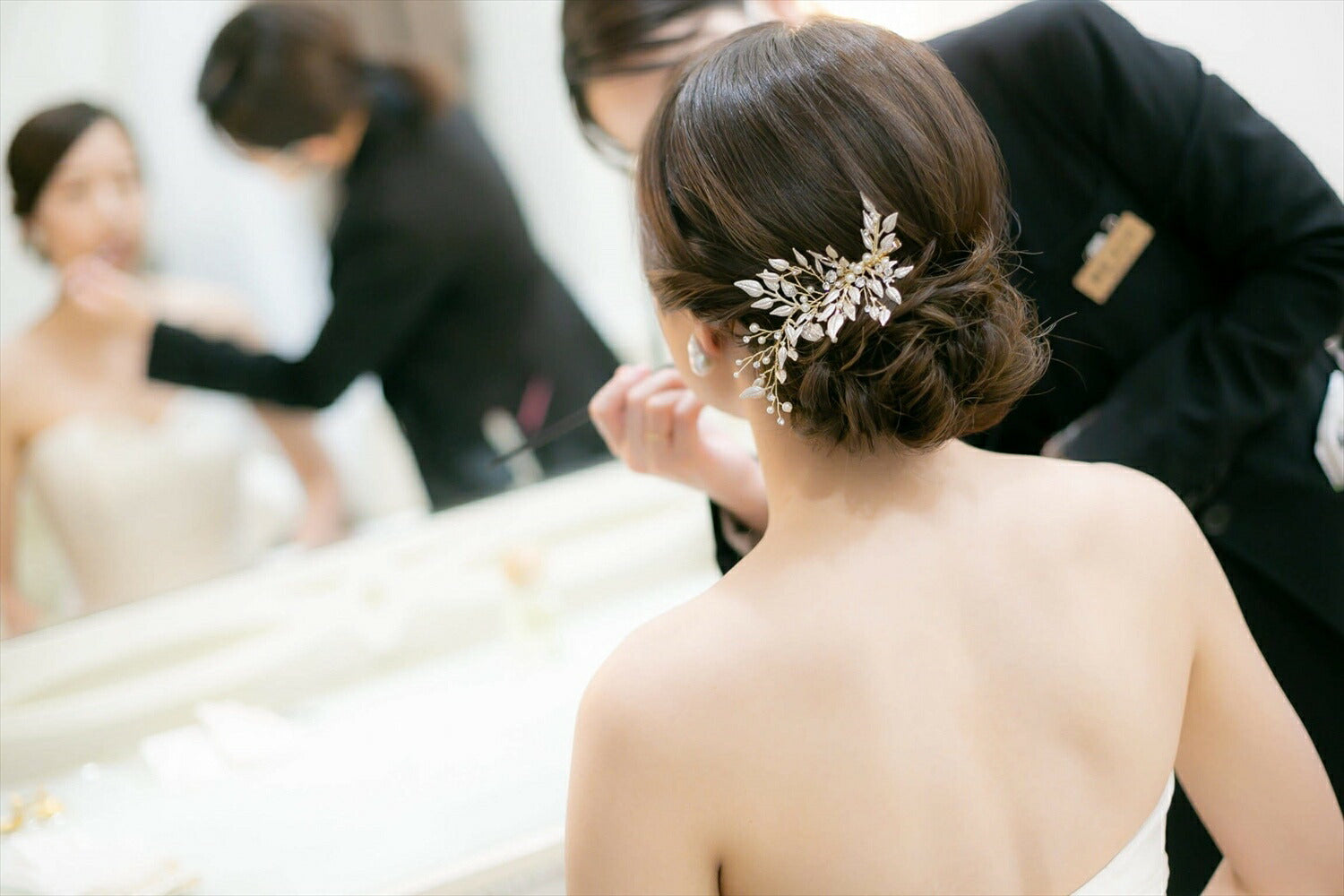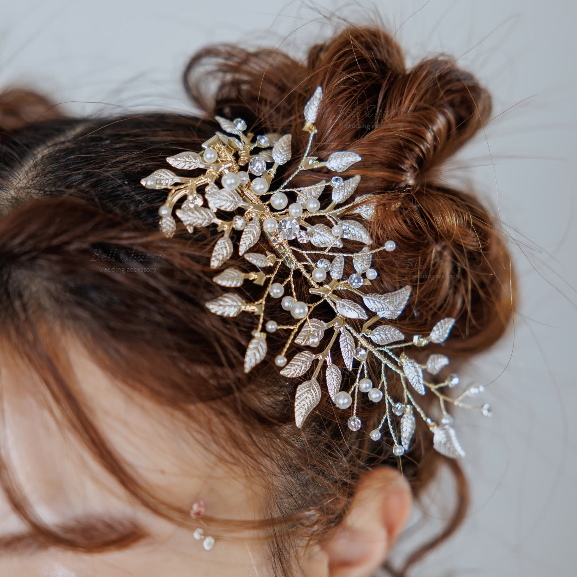 シルバーのリーフとゴールドの枝分かれが繊細に表現されたヘッドドレス。