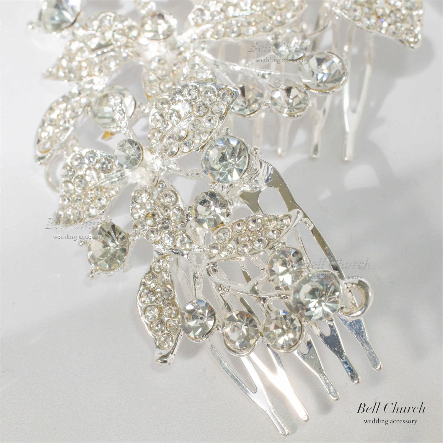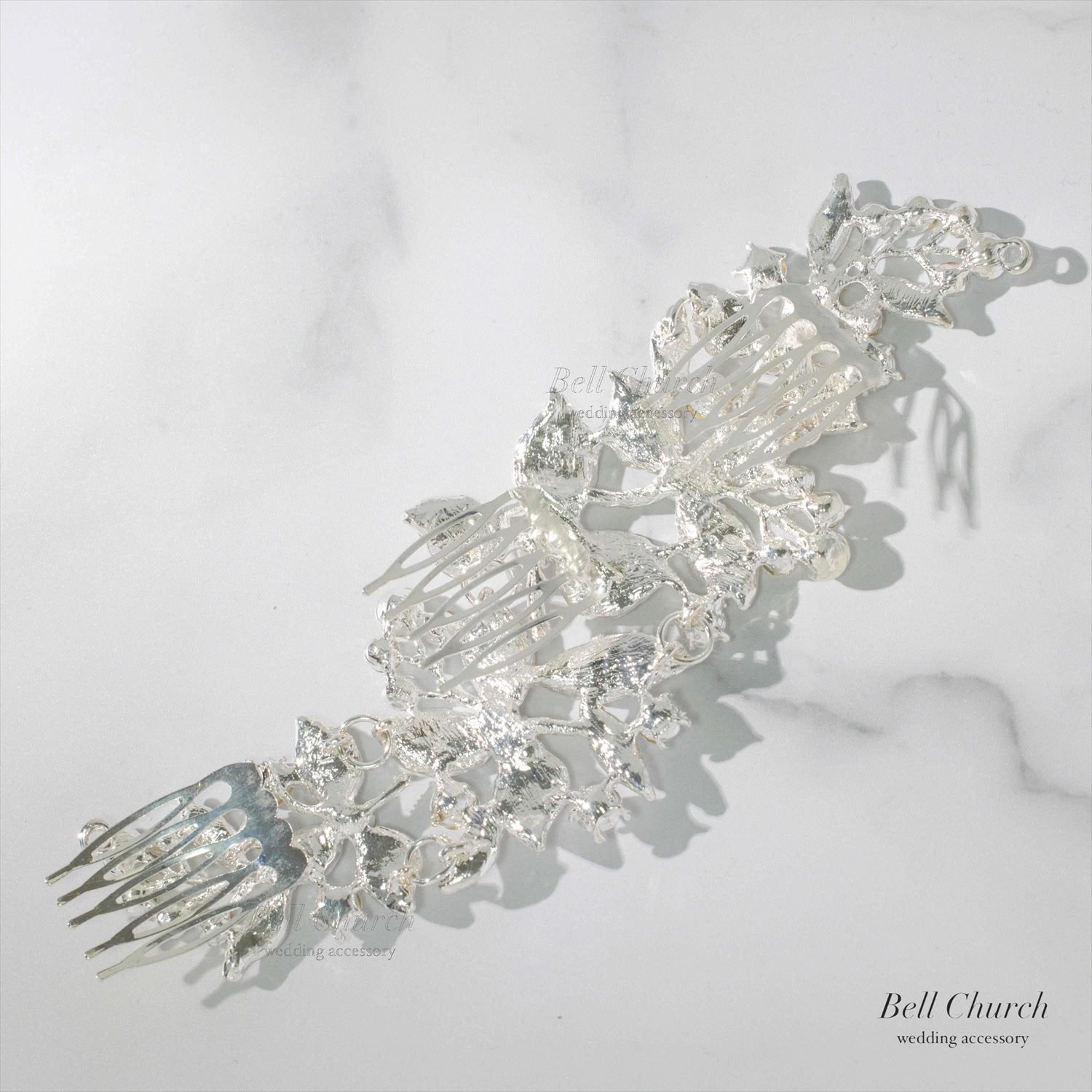 美しい曲線をえがいたリーフモチーフの配置が上品な華やかさを演出し、ひとつ付けるだけでも存在感のある輝きで花嫁様のヘアスタイルを彩ります。