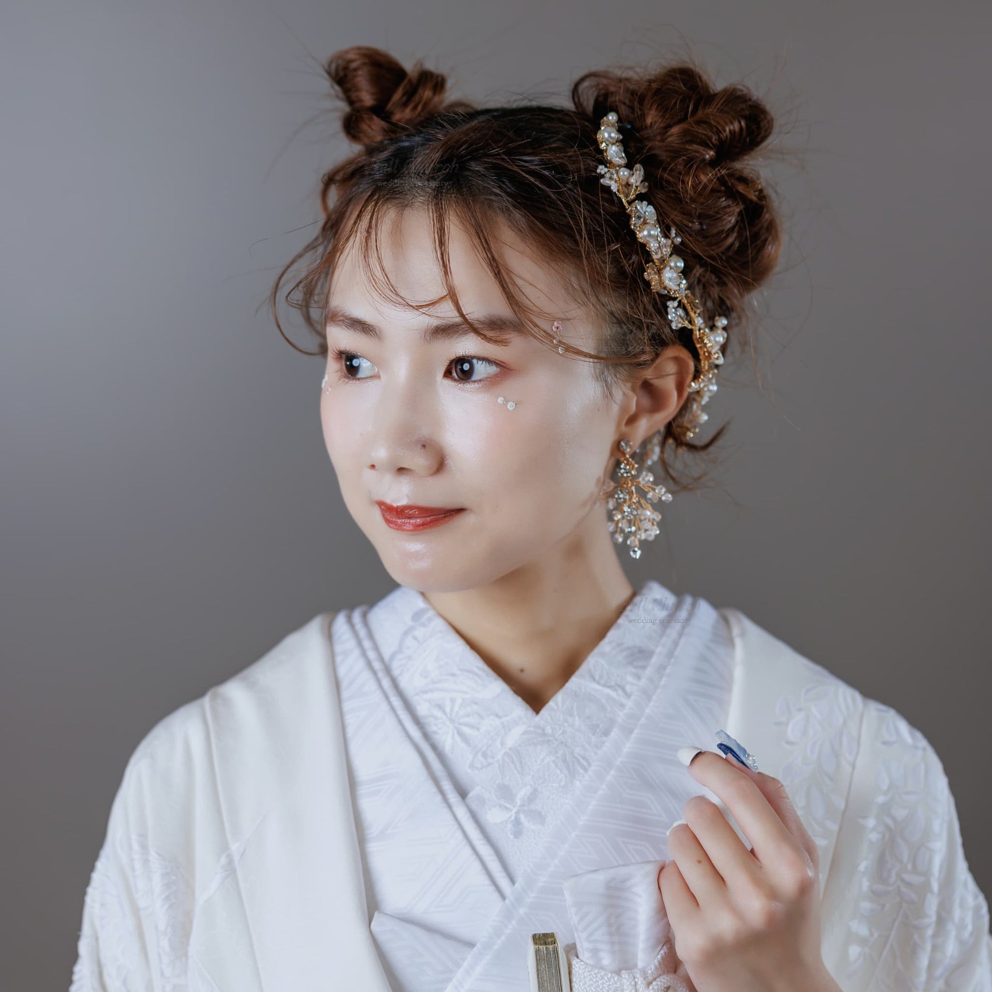シンプルなドレスと合わせて凛とした雰囲気に、お花モチーフのアクセサリーと合わせて愛らしく、花嫁様の美しさをより一層きわだててくれます。