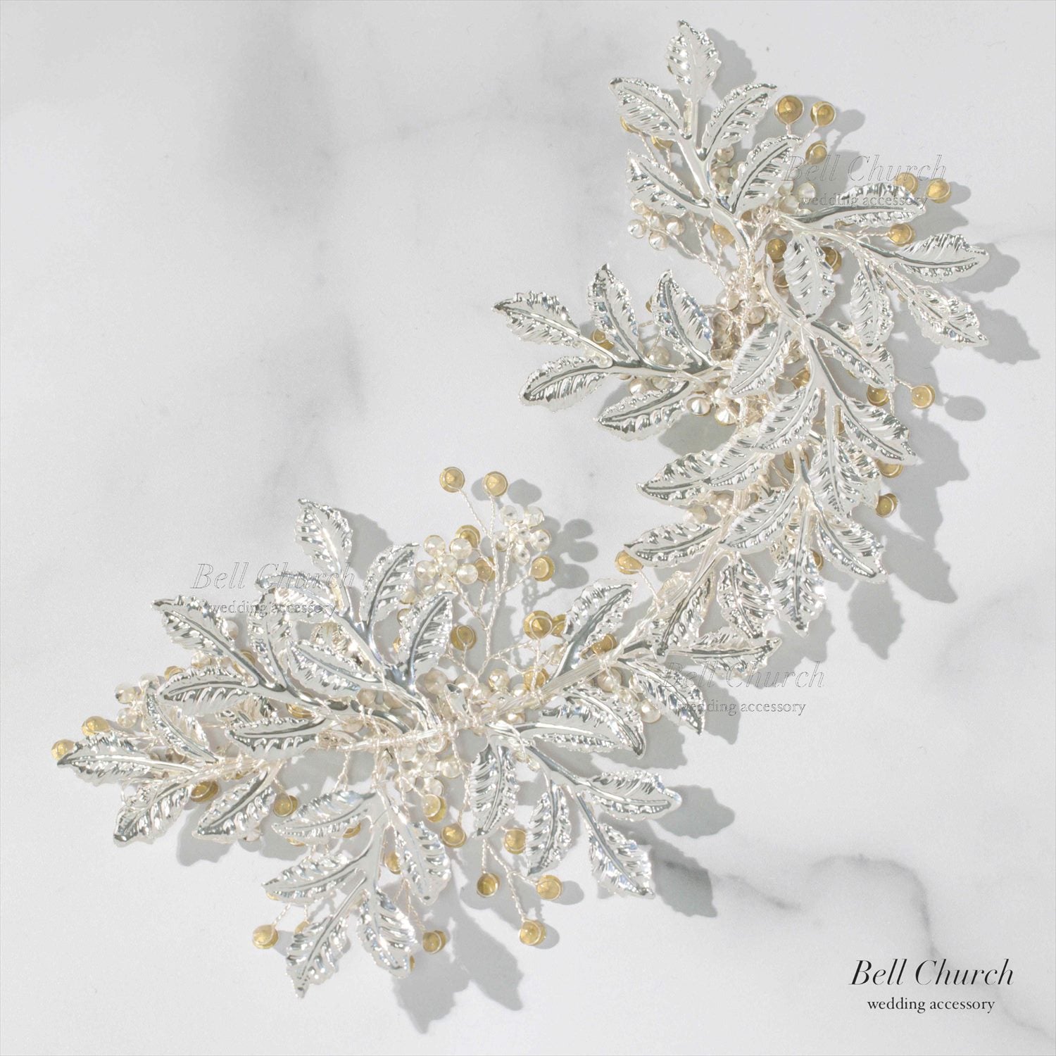 流れるような曲線が美しいシルバーでかたどられたリーフモチーフのヘアアクセサリー。
