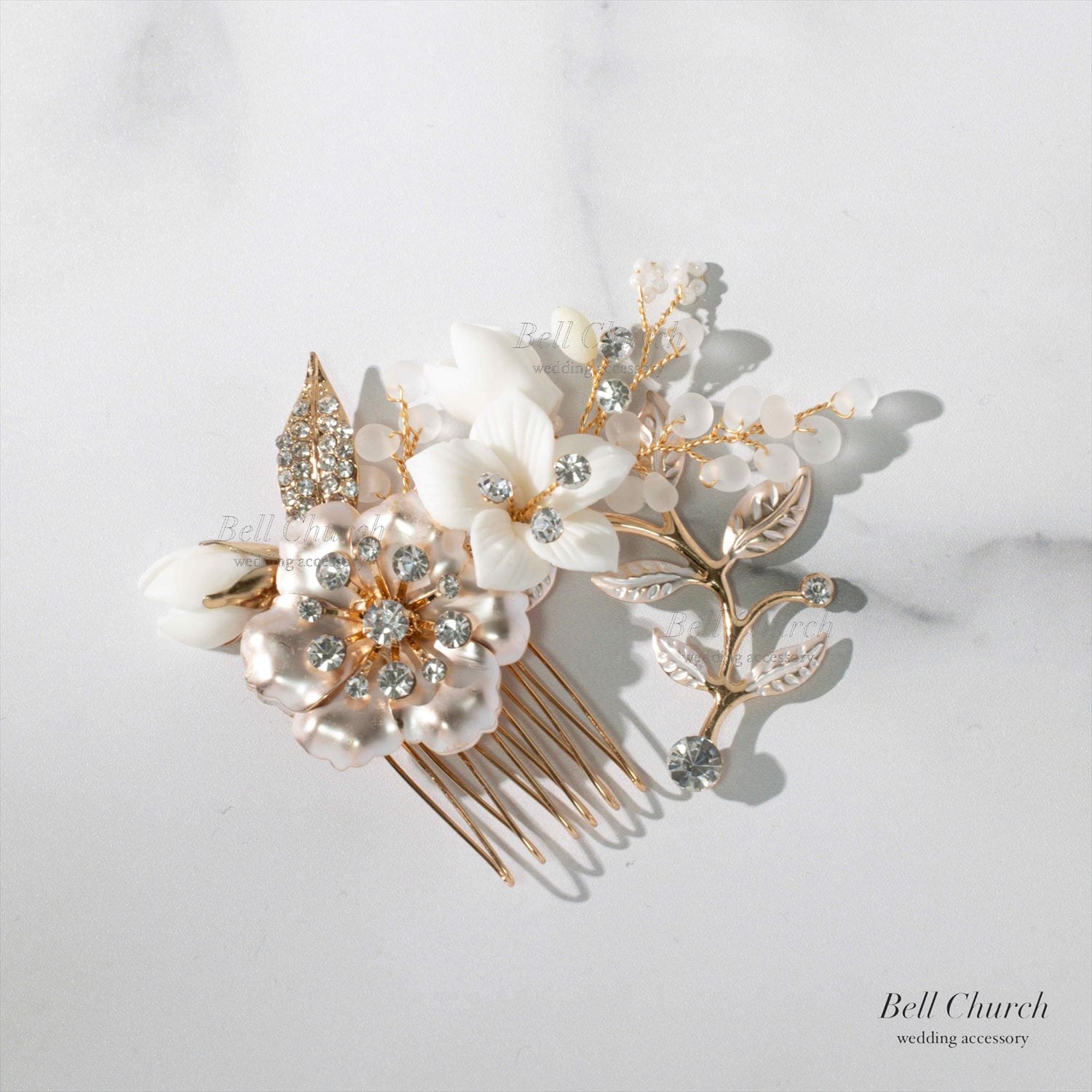 ヘアコームは大中小、それぞれセパレートでお好きな場所に配置できるので、360度美しく花嫁様のヘアスタイルを彩ります。