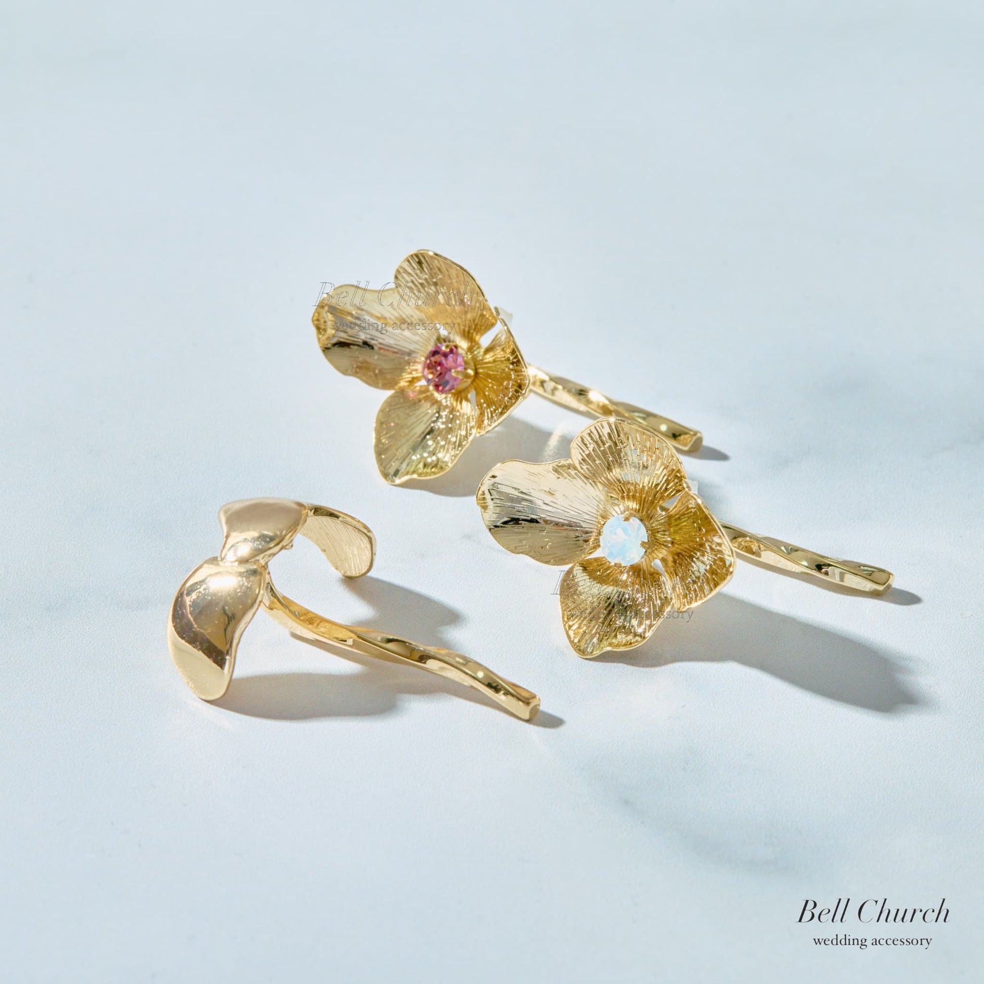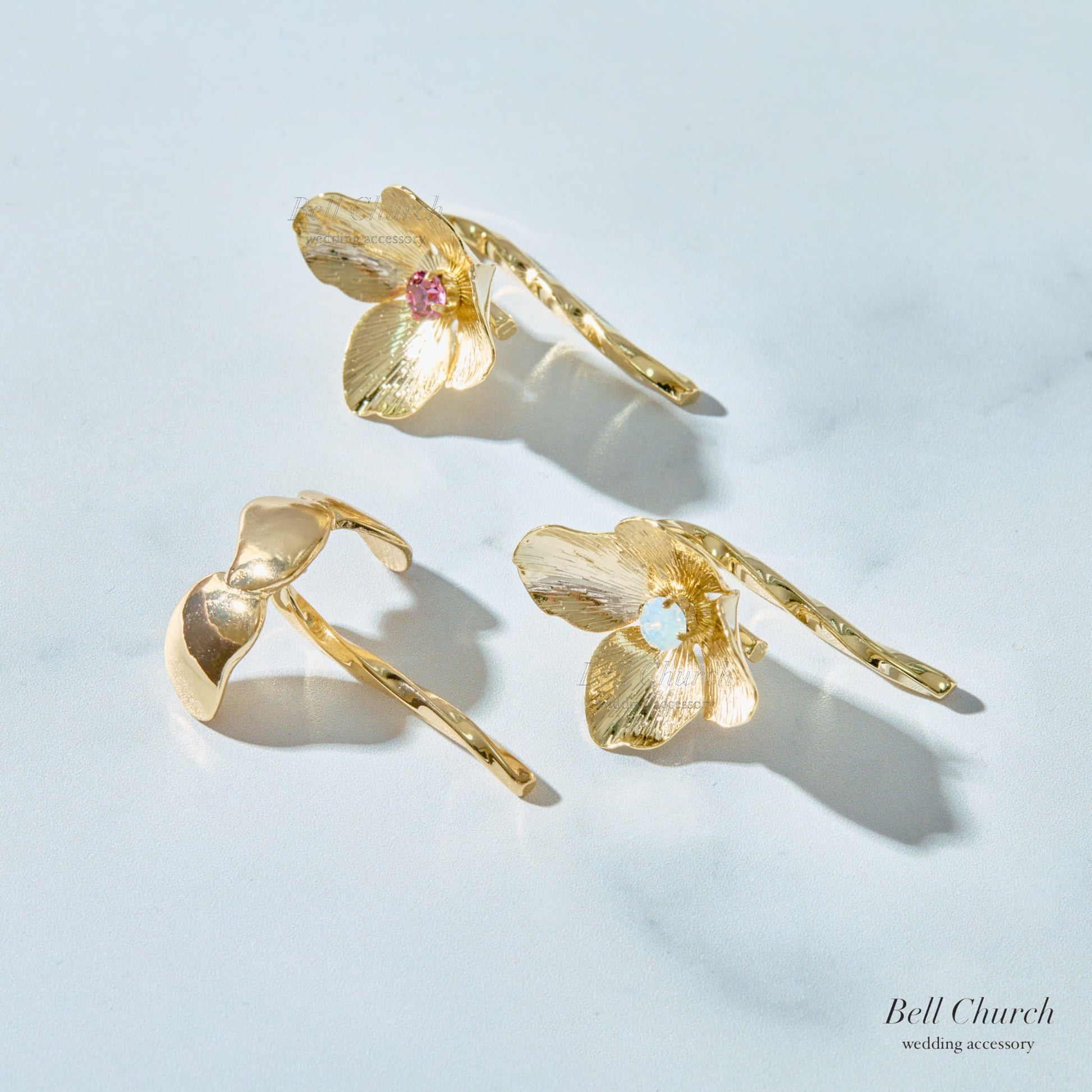 ヘアカフ 3点セット ヘアポニー ポニーフック お花 フラワー ペタル メタル ストーン ミニカフ|ゴールド (BC-H62)【結婚式 アクセサリー ヘアアクセサリー ヘアカフ】