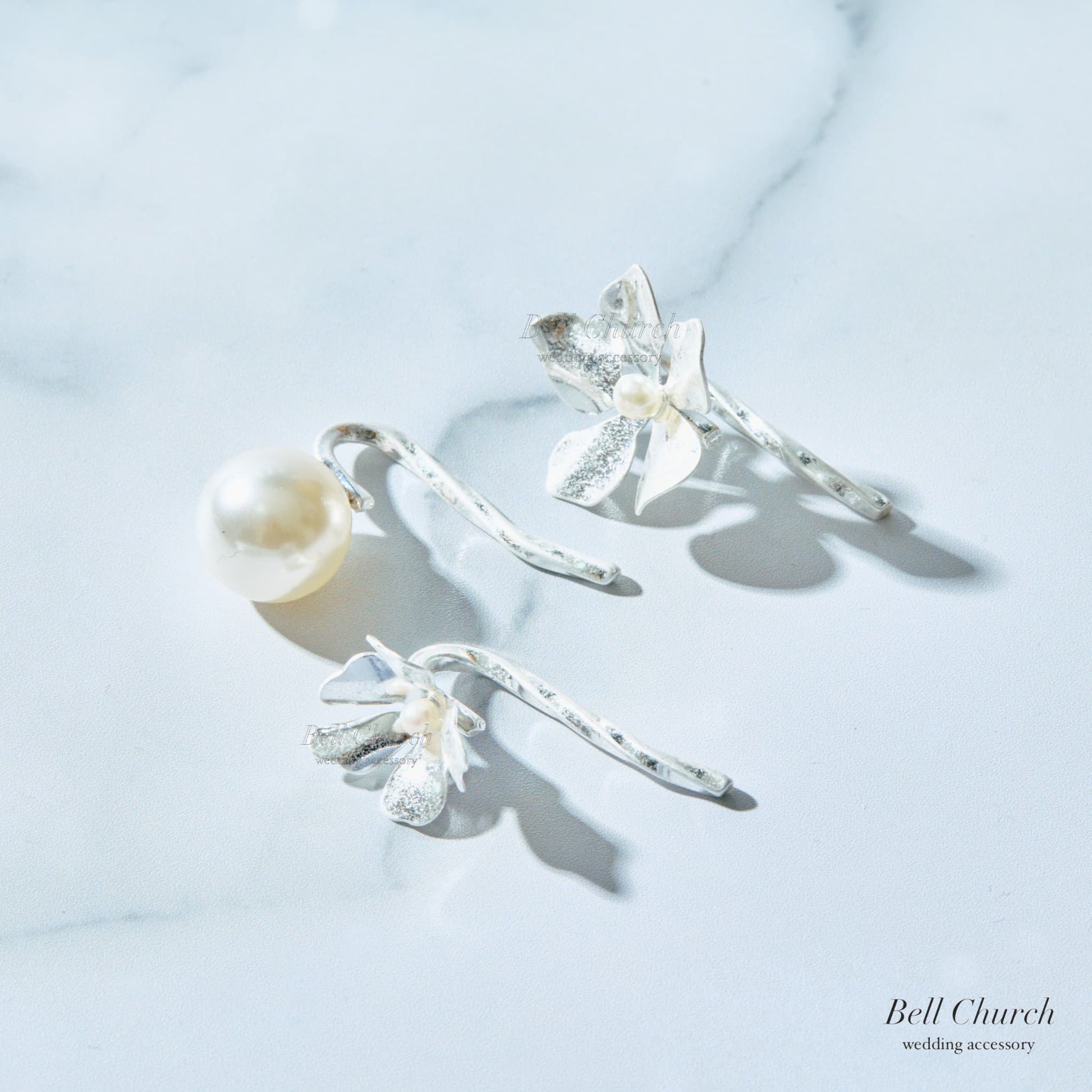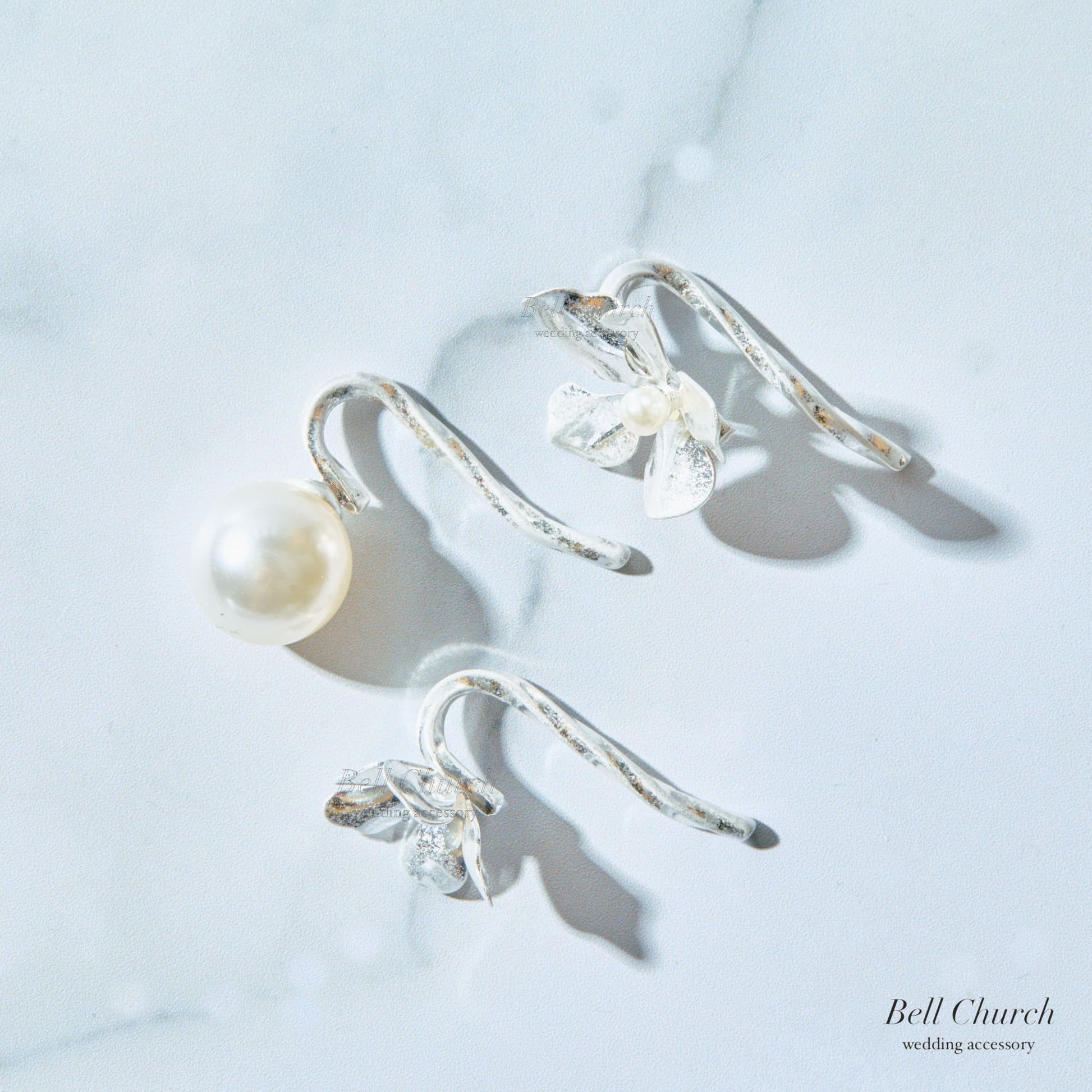 ヘアカフ 3点セット ヘアポニー ポニーフック パール お花 フラワー ペタル メタル ストーン ミニカフ|シルバー (BC-H67)【結婚式 アクセサリー ヘアアクセサリー ヘアカフ】