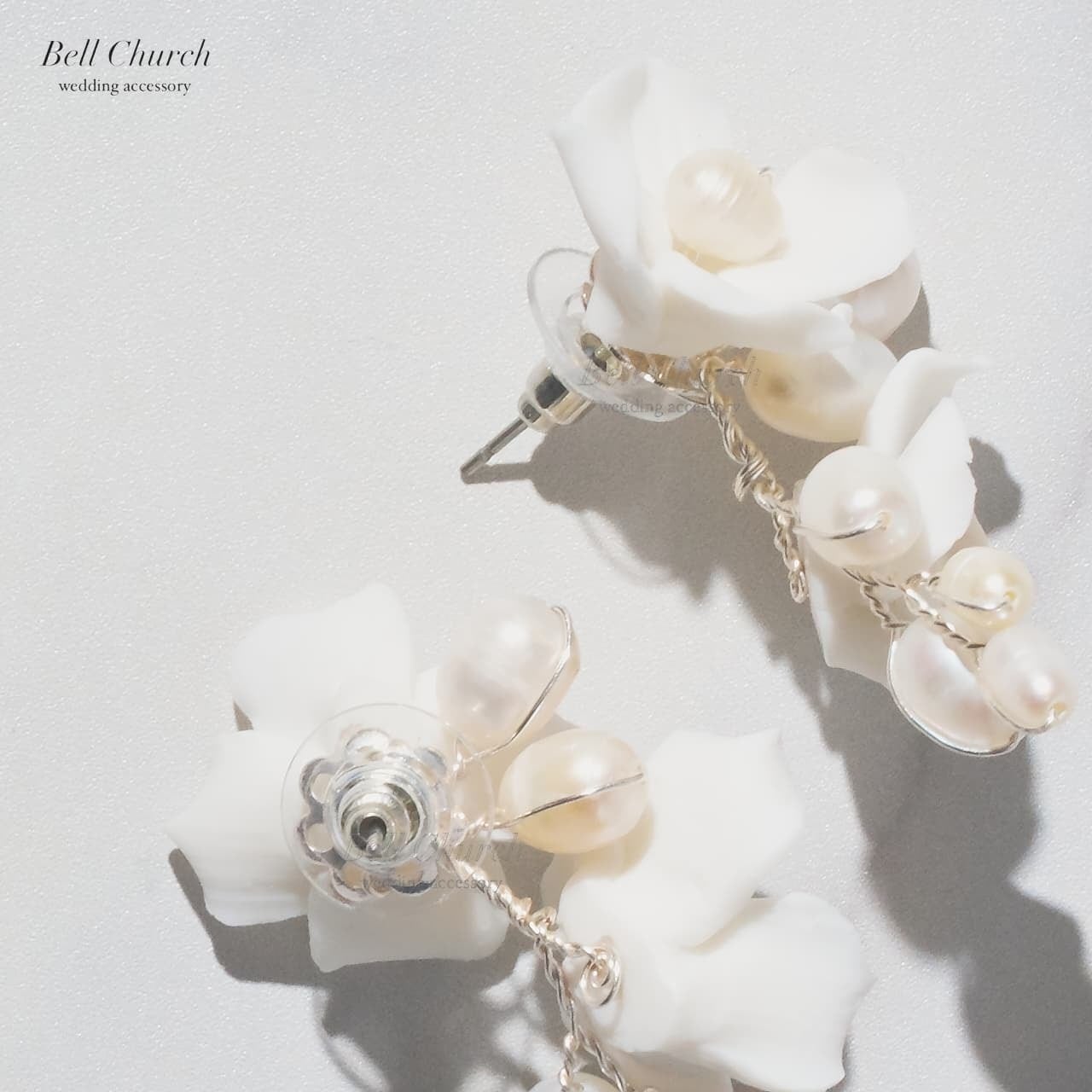 上品なパールがあしらわれたホワイトのお花が、2輪佇む可憐なピアス・イヤリング。