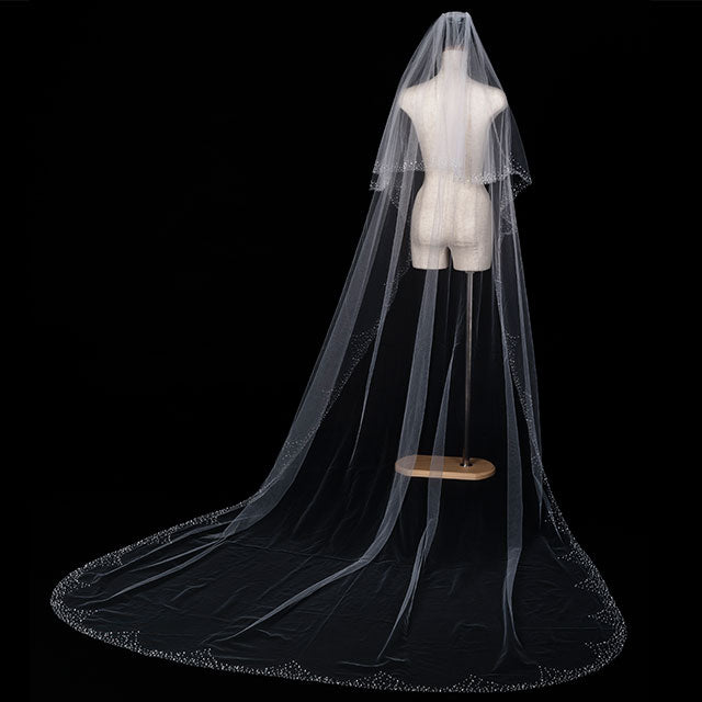 美しさを引き立てる特別なブライダルアクセサリー、【ウエディングベール】V3033-1(Lサイズ0.6+3M)の登場です!この華やかなウエディングベールは、クリスタルの輝きが美しく、特別な日の装いにぴったりな一品です。華やかさと上品さを兼ね備え、あなたの特別な瞬間を一層引き立てます。