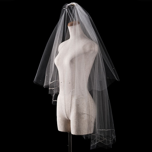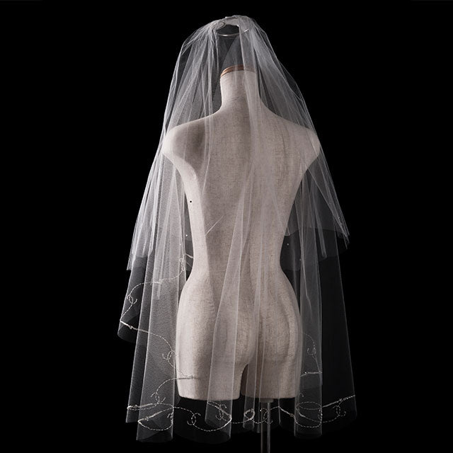 美しさを引き立てる特別なブライダルアクセサリー、【ウエディングベール】V3108-1(Sサイズ0.6+1M)の登場です!スカラデザインのベールにシンプルなビーズ刺?が施されたこのアイテムは、特別な日の装いにぴったりです。上品なデザインが、あなたの特別な瞬間を美しく演出します。