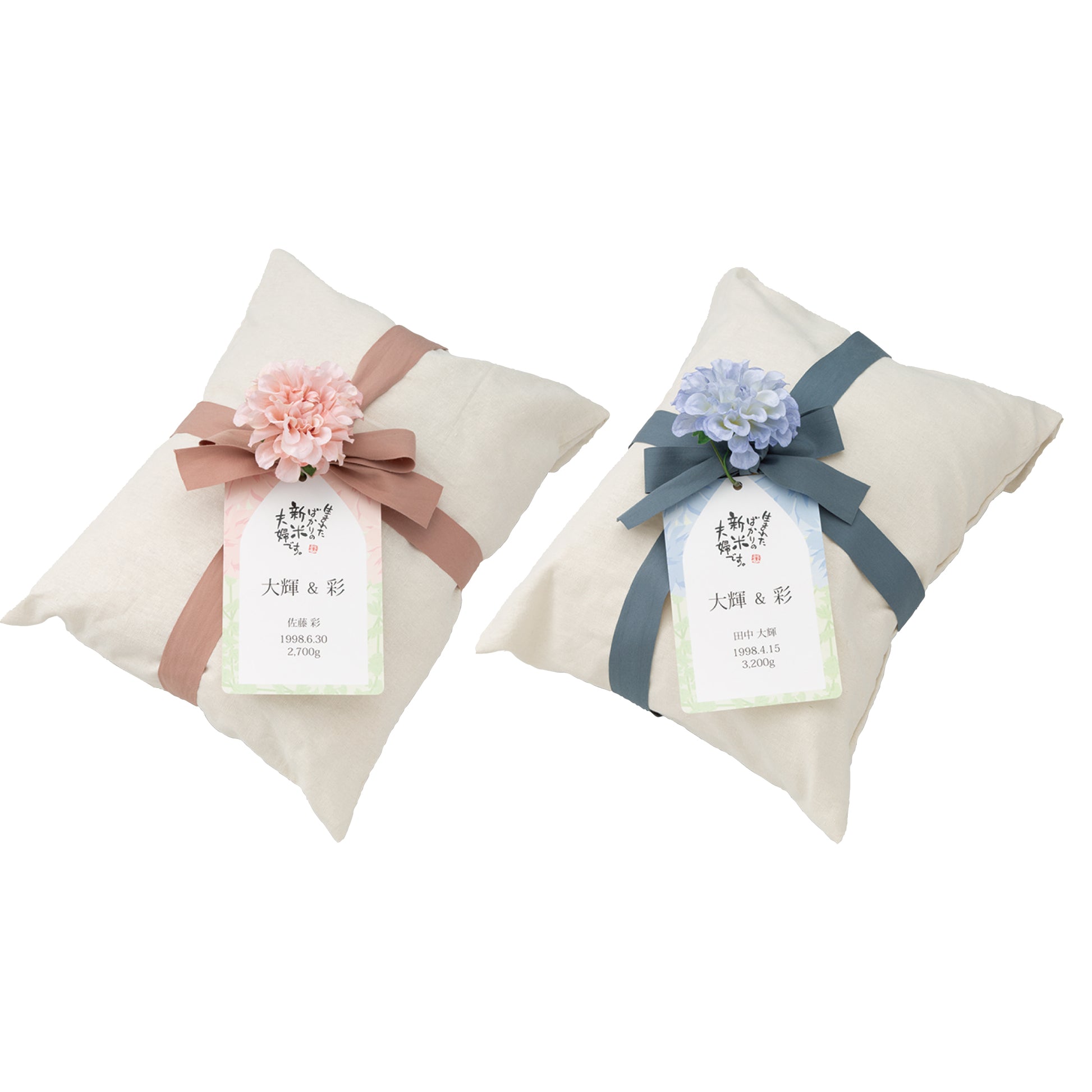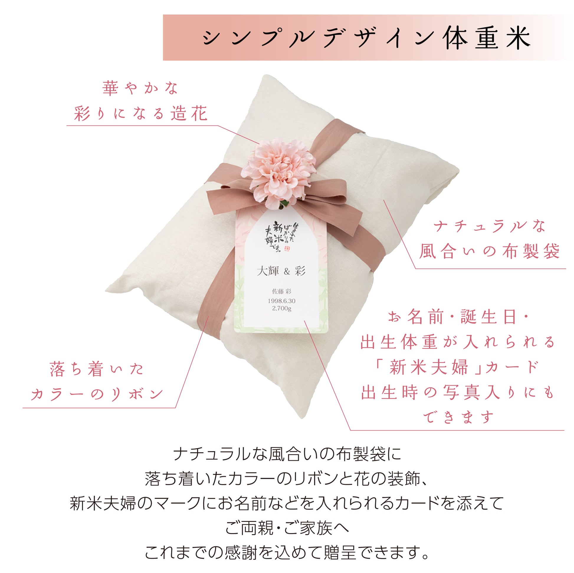 生まれた時の重さを思い出してもらえる体重米を入れた俵形で、「生まれたばかりの新米夫婦です」と宣言する気持ちとご両親への感謝を込めて贈る、記憶に残るプレゼントです。