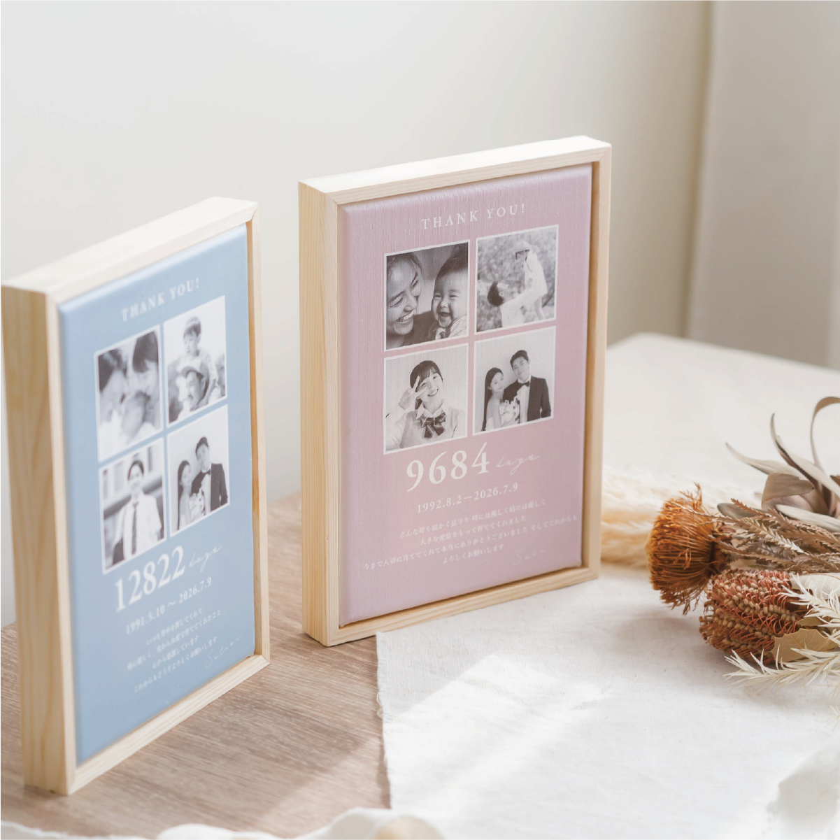 4枚の写真・記念日・お名前・メッセージを丁寧にレイアウトした、